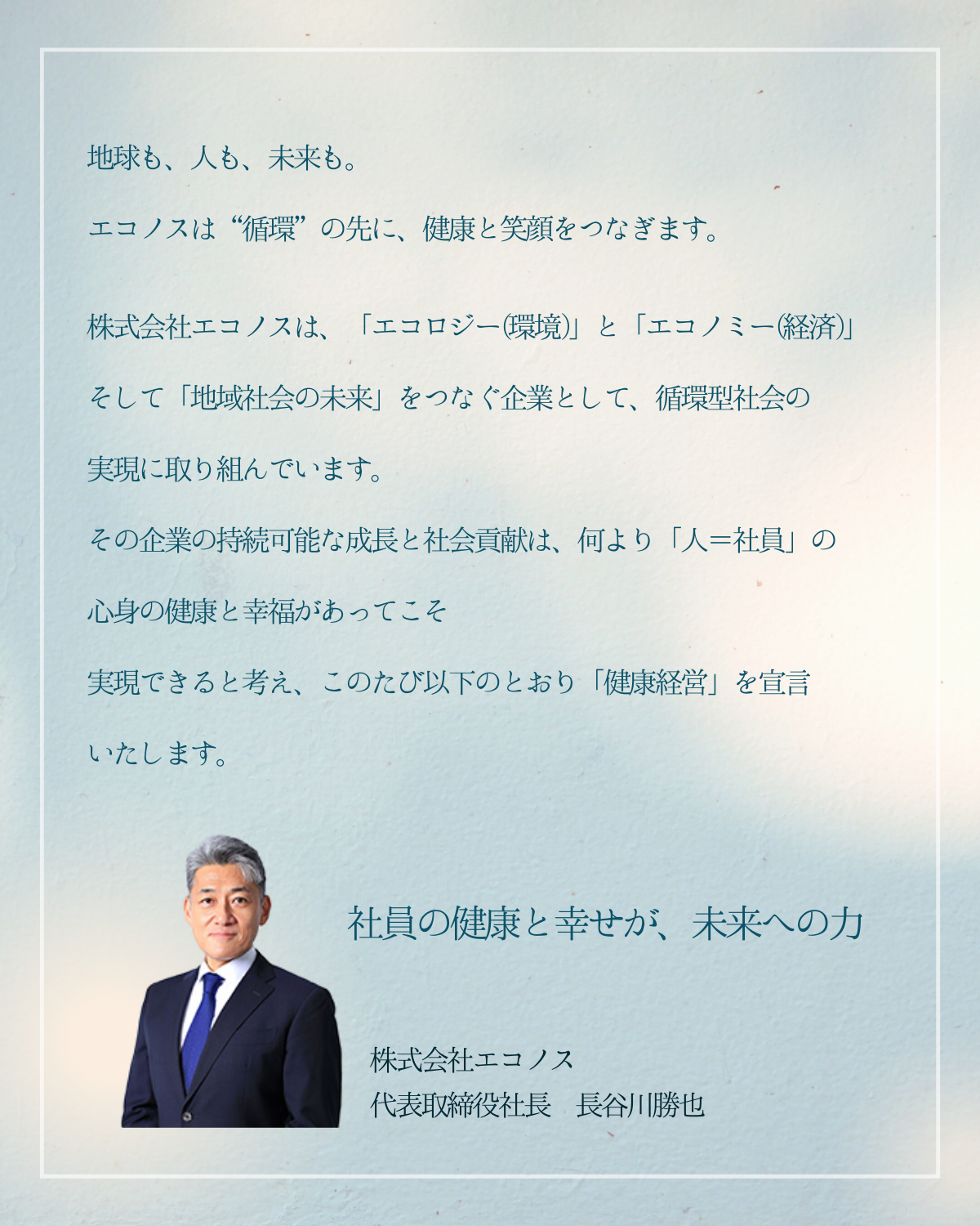 MAIN 2026.03.14 健康経営宣言 従業員の健康と働きやすい職場づくりを推進しています 健康経営の目的 取り組みの背景 エコノスでは、「企業は人財がすべて」という信念のもと、共に働く全スタッフをかけがえのない財産=「人財」と捉え、その育成を経営の最優先事項に掲げています。2026年を「健康経営取り組み元年」と位置づけ、健康経営推進委員会を組織いたしました。スタッフの心身の健康こそが組織活性化と人財定着の基盤であると考え、具体的な課題解決に向けた施策を展開しております。今後も産業医や健康保険組合と密に連携し、全社一丸となって、より良い職場環境の整備と持続可能な社会の実現に邁進してまいります。 解決したい経営上の課題 リユース店舗の安定的な出店と事業拡大を通じて、環境(エコロジー)と経済(エコノミー)が共生する循環型社会の実現に寄与してまいります。この大きな挑戦を支えるのは、現場で培われたノウハウを持つ既存のスタッフと、次世代を担う新たな仲間たちです。一人ひとりが心身ともに健やかであり、高いワークエンゲージメントを持って長く活躍できる組織であること。私たちは、これを持続的な成長に向けた最重要課題と捉え、全力で取り組んでおります。 実践により期待する効果 推進体制 取り組みの背景 エコノスでは、「企業は人財がすべて」という信念のもと、共に働く全スタッフをかけがえのない財産=「人財」と捉え、その育成を経営の最優先事項に掲げています。2026年を「健康経営取り組み元年」と位置づけ、健康経営推進委員会を組織いたしました。スタッフの心身の健康こそが組織活性化と人財定着の基盤であると考え、具体的な課題解決に向けた施策を展開しております。今後も産業医や健康保険組合と密に連携し、全社一丸となって、より良い職場環境の整備と持続可能な社会の実現に邁進してまいります。 解決したい経営上の課題 リユース店舗の安定的な出店と事業拡大を通じて、環境(エコロジー)と経済(エコノミー)が共生する循環型社会の実現に寄与してまいります。この大きな挑戦を支えるのは、現場で培われたノウハウを持つ既存のスタッフと、次世代を担う新たな仲間たちです。一人ひとりが心身ともに健やかであり、高いワークエンゲージメントを持って長く活躍できる組織であること。私たちは、これを持続的な成長に向けた最重要課題と捉え、全力で取り組んでおります。 実践により期待する効果